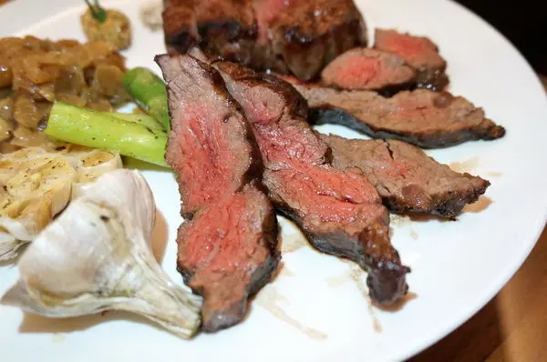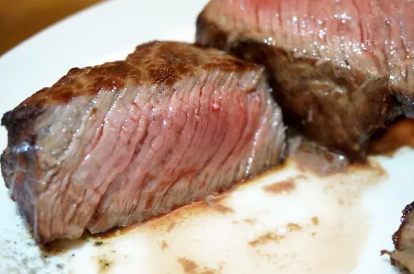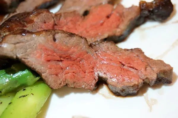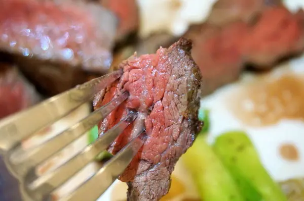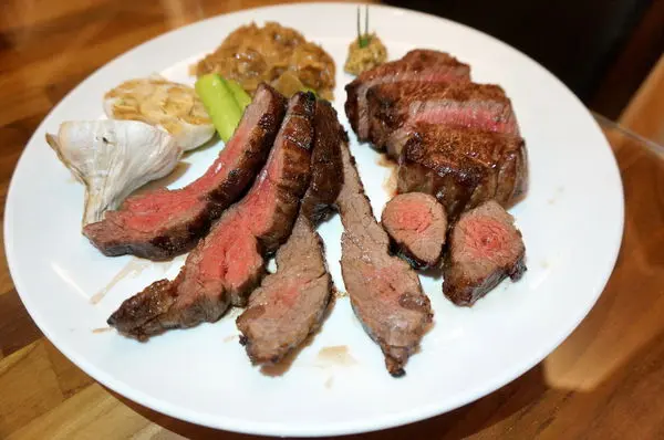 牛排橫切面可以觀察一下, 熟成牛排的特色就在這裡, 由於牛肉熟成風乾而造成大部分水分流失, 所以血水是看不到的, 還有肉看起來是一絲一絲, 但不會因沒水分而乾柴, 反而是酵素將筋腱分解了, 肉香變的更集中及軟嫩