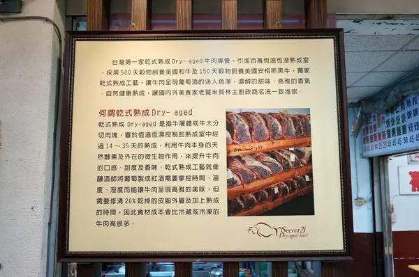 熟成牛排大家有聽過了嗎? 這陣子熟成牛排的興起讓這話題慢慢的燃燒中, 熟成牛排到底是什麼? 煮熟的牛排嗎 當然不是啦. 基本上熟成牛排就像葡萄酒一樣, 經過熟成發酵讓牛肉嫩度/風味/含汁性更為提高. 熟成也分為乾式及濕式熟成. 前陣子小米才品嚐完"濕式"熟成牛排, 覺得果然是非同凡響, 今天來到台中是Secret 21 乾式熟成牛排, 乾式熟成又是什麼美味? 待會小米再來跟大家介紹啊