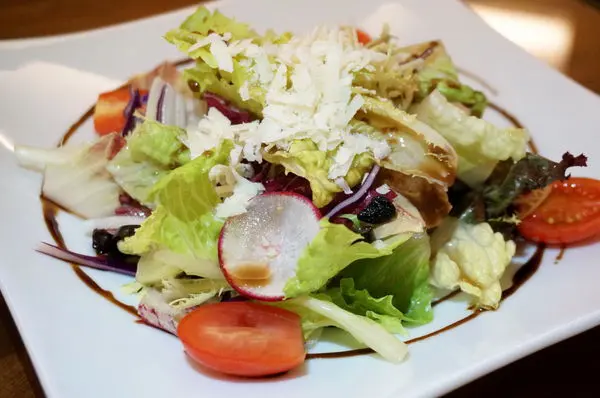 主廚沙拉, 新鮮蔬菜配上義大利巴薩米克紅酒醋, 薩米克紅酒醋小米覺得口味較重, 與蔬菜配起來剛剛好, 而且紅酒醋是帶一點點甜, 所以是酸甜酸甜口感, 也可引出蔬菜清甜. 另外灑在上面是現刨帕瑪森起司, 是較為鹹味起司, 用來搭配蔬菜也不錯呢