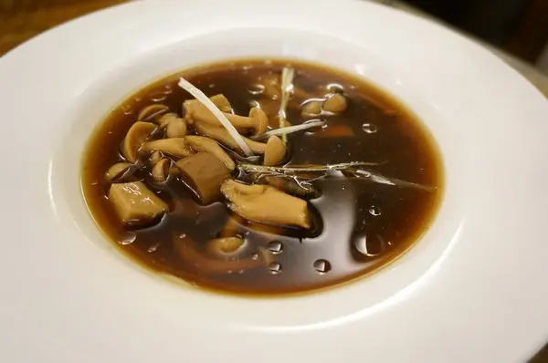 野生牛肝菌菇湯, 上桌時有濃濃的野菇味撲鼻而來, 色澤上是黑亮鮮明, 浮在小火慢燉雞湯上面的是義大利阿爾巴黑松露油, 還有綜合菇份量也不少呢