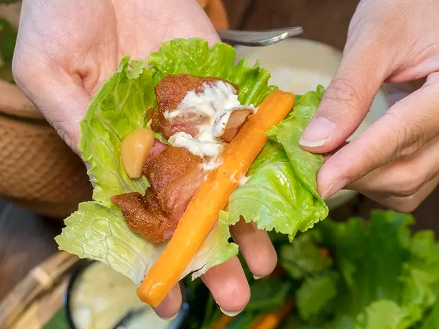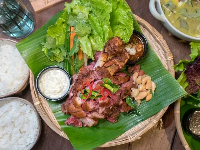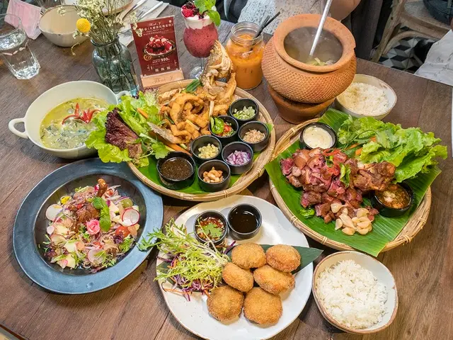 這道料理是Thai J 泰式料理近期的新菜色,採用了一整隻的鱸魚大火快炸,完整保留的魚的鮮,沒有調味先來一口,入口外酥內軟的鮮香迷人。店家提供了恰克魯醬、腰果、紫洋蔥、檸檬丁、薑絲、辣椒..等等配料,利用生菜挑選自己喜愛的配料,包覆著大口享用,吃出滿滿的泰式風味鮮炸魚
