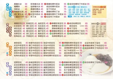 q彈粉粿布丁豆花 / 五種冰 / 豆花配料 / 豆漿粉粿 / 招牌冰 / 花生牛奶豆花 / 紅豆豆花 / 紅茶 / 原味粉粿 / 情人果冰 / 黑布牛豆花 / 黑糖豆花 / 綜合豆花65 紅豆牛奶豆花55 / 鮮奶豆花 / 修安豆花