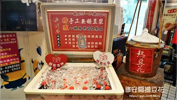 耶,台南行終於來到最後一篇了,其實我也才玩了兩天一夜阿,怎麼感覺寫很久的樣子~XD,這一家修安扁擔豆花是在海安路、神農街附近,所以可以先來 水仙宮市場覓食,吃吃扁擔豆花及特色小吃後,在去附近景點歪拍一下,光是這附近大概就可以安排個很充實的一日遊。從早玩到晚,也從早吃到晚這樣~~ 怪獸茶舖的對面就是水仙宮市場了,這裡就是他們的菜市場,如果想來買菜也可以進去逛逛,哈哈.. 這裡也有很多在地小吃,但因為我們才從怪獸茶舖吃完早午餐出來,所以就只好看看就好 就在這不遠處的三叉口就可以看到修安扁擔豆花了,這一家可是當地的老店呢~ 扁擔豆花顧名思義就是早期的創始人,會固定挑擔沿街在赤崁樓、小公園一帶賣豆花,後來因為喜歡水仙宮市場這地方,所以就長期固定在此賣豆花,久了就成了在地小吃,並由創始人的外孫傳承下去並開成店面,然後就一直賣到現在了!! 他們賣的品項真的太多,看的我眼花撩亂,覺得選最傳統的豆花跟烤布丁就好.. 他們的熱豆花是真的在扁擔裡唷,只是天氣太熱,我不想吃熱豆花.. 傳統紅豆豆花我覺得他們豆花好綿好綿,而且還有一股黑糖香氣兒,我真的還蠻喜歡的,吃得出是純手工的綿密口感,很值得推薦︿︿ 手工焦糖烤布丁 25元/個他們的烤布丁有四大原則;一、絕不添加防腐劑二、不添加色素三、不添加香料四、不添加一滴水嚴選林鳳營鮮奶與挑選最新鮮雞蛋製作而成...濃郁的焦糖香氣伴隨著布丁的香草蛋奶口感,綿密又濃郁香甜,好吃是好吃,對我而言還是太甜阿(攤手)查看更多