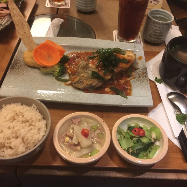 ウーロン茶 / 手工 魚 漿 天婦羅 套餐 / 安平紅茶茶包 / 肉骨茶雞肉火鍋 / 決明子茶 / 豆皮 / 南瓜牛奶鍋 / 厚道鮮奶茶和柚子茶 / 枸杞菊花茶 / 炸天婦羅 / 炸薯條 / 蔥燒鱸魚 / 餐後 甜點 / 霜乳青茶
