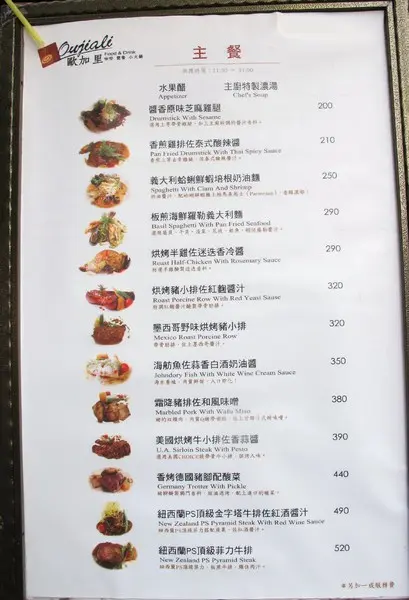 成大的異國美食兩條街18巷跟22巷是許多成大學生的約會餐廳美食記憶今天要介紹的歐家裏對皮老闆來說並不陌生好幾年前舊家住在附近時就去歐加里用餐過多次了隨著18巷與22巷餐廳時代的淘汰附近好幾家餐廳都換了好幾次了只有他們家依舊屹立不搖想必他們的餐點是真的經得起考驗的過去曾在他們家吃過下午茶跟火鍋義大利麵等等對於印象中的味道就是中規中矩因為平價又可以做很久聊天的好地方所以總是我們家聚餐的選擇菜單單點價位在200-500上下升級套餐+$150附沙拉 開胃菜 水果醋 麵包 濃湯 與 $120飲品(需加+10%)煙燻鮭魚有機沙拉簡單俐落的擺盤挺討喜的老闆娘說這一季菜單有更新他們請了從法國回來的廚師從食材選用的堅持跟擺盤藝術都可以發現不同沙拉的醬汁是紅酒油醋酸中帶甜挺開胃好吃的煙燻鮭魚也是一大塊肥美燻香乳酪歐式麵包裏頭有大量的乳酪丁個人滿喜歡的野菇松露濃湯佐培根肉乾他們家的這款濃湯相當好喝濃郁厚重的味道順口不膩義式番茄湯由兩款湯品就可以明顯感受到他們家的變化對食材的堅持一喝就知道沒有假假的粉稠味兩款表現都相當優秀開胃菜是-煙燻火腿+綠扁豆+櫻桃蘿蔔佐蝦夷蔥乳酪老闆娘親自服務教我們吃法將煙燻火腿切丁加點綠扁豆搭配櫻桃蘿蔔一起吃三種不同的層次再搭配乳酪更有不同韻味淡淡的勳香甜蘋果醋飲跟檸檬雪酪喝點酸的可以清清口中的味道奶油青醬雞排燉飯 $280脆皮雞腿排三大塊論單點的價位這分量相當滿足青醬燉飯相當入味好吃脆皮雞排的肉質也很鮮嫩多汁燉飯的份量也滿多的整體不會覺得油膩嫩煎綜合海鮮拼盤 $520光是擺盤裝飾就相當藝術基底的將士黑色墨魚醬 (吧?跟紅色甜甜的蔬菜醬 (自己亂取的名字哈哈嫩煎的海鮮搭配兩款醬汁簡單就可以吃的到海味香煎魚排口感有點像多利魚大干貝跟鮮蝦都相當甘甜整體來說相當清爽好吃…查看更多