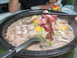 真味石頭火鍋(小北觀光夜市)台南市北區西門路四段小北觀光夜市 A65營業時間:17:00-01:00電話: 062518346 昨天在老闆車上突然覺得自己好像很需要補充維他命C,所以我們想說就近前往小北阿松喝個果汁給他均衡一下。喝完果汁之後不知道是不是膳食纖維促進腸胃運動,突然又想吃啟動下一攤模式東西。也將近傍晚時分,就在小北就近用餐吧。兩個人邊走著邊討論要吃哪家,是照例去榮吉吃個牛肉火鍋或是上次網路上看到人家推薦的小李呢? 突然有一個聲音:『吃火鍋裡面看看喔~』是個有年紀的叔叔殷勤帶著微笑站在門口招呼。我看你你看我遲疑了一下,不然試試看好了。攏出來了,出外人吃個止餓就好。反正牛肉火鍋常吃而小李改天再來探店。看老闆招呼的這麼有誠意進來試試。 時間約下午5點多剛開店,老闆娘也好正還在進行一些食材準備的工作。所以我們在座位上稍坐休息等待,鍋子先端了上來就位。 老闆介紹說這個鍋子有二三十年的歷史了,難怪看起來有那種不沾鍋的光滑。這時候老闆娘通知料都備齊,可以到冰箱取菜了。我們到冰箱前駐足了一下,挑選一些我們想要吃的火鍋料與食材。 既然店名是真味石頭火鍋,當然少不了一招先爆香炒肉後加入高湯的表演秀。相當特別的是這裡爆香的過程,他會加入魷魚乾絲與香菇。 而且恰好我們拿了一盤肥腸,老闆在爆香的過程也順便幫加下去爆香增加那種脂肪與膠質乾煸的氣味。關於石頭火鍋的爆香也分好幾個流派、有的爆完會直接把湯倒下去一起滾、這邊則是爆香時會在肉的熟度大概八分程度就撈起來。 這樣子有個好處!就是煮的時候就不容易過熟,到時候湯滾下去再涮一下就可以吃了。夠維持肉那種柔嫩的狀態。 到佐料區準備沾料時,老闆娘很熱情的幫我們盛飯,實在是不好意思讓長輩幫忙。 飯上來時他強調選用的米是比較精心挑選過,相對比較飽滿,而且米粒分明吃起來的口感還不錯。對我這愛吃飯的人來說,是真的會有你吃飯的感覺。不會濕黏或者是硬米過粒,並不因為是配角而隨便。 等待湯滾的期間還發生一個小插曲,我發現那個白蝦竟然給我跳了一下!老闆卷見狀過來說明他們對採購上的堅持,所以上桌的時候自然還是活跳跳的。其餘蛤蠣的部分應該有一吋以上的尺寸,拿個$50硬幣相比還比硬幣大。煮熟之後肉非常的飽滿不是只有外殼好看而已。 因為是第一組客人,備完料之後老闆娘就過來桌邊聊天。在聊天過程中他們不斷信心滿滿地推薦自己手作的火鍋料,尤其是貢丸。對貢丸非常熱愛與挑剔的我怎麼能夠不試試看呢!接下來就跟大家分享他們的火鍋材料貢丸:我願意一層一層一層的剝開…..喔!這不是洋蔥卻也一層層的可以看到紮實肉漿製成的鮮美貢丸。 燕餃:呈現三角狀的這可以不是水餃而是肉燕皮包的燕餃。 魚冊&魚餃:裡面還有蝦米跟芹菜,更有海味與一絲清甜味。 白蝦:鮮度滿點。 蛤蠣:大又飽滿。 豬肝:走水走的很乾淨都沒有異味。 肥腸:台灣本產,以斜刀切成更大片更有口感。 黑輪:手工小黑輪。 米血:菜市場圓形的那種米血。 排骨酥:裡面是紅糟醃的排骨,甜鹹口味。 蔬菜:多吃菜有益。 加湯:看起來清湯寡水,但是一口下去你可以感受到背後的材料與過濾的用心。 整鍋煮到最後鮮味越來越濃厚,他爆香時候使用了香菇是關鍵點。爆炒時香菇的味道就有被熱度逼了出來,而煲湯的過程香菇也不斷地揮發他核苷酸的作用。所以到後來你會覺得有點偏香菇高湯的,喝起來只是一種鮮淳的感覺。 原本我們只有兩個人用餐,後來覺得好像不小心點太多又叫了一個朋友過來幫忙吃。但是我覺得這樣子點是剛好的,都可以吃到他一些經典的味道。所以建議想過來嘗試的朋友盡量揪團來反正吃火鍋團聚的感覺也很溫暖,兩個人來有些東西真的必點但是可能吃不完不然就是要在經典口味間做取捨。因為他的手做食材就是紮實!尤其貢丸的部分,你可能吃個幾顆就有可能會覺得非常的有飽足感,密度相當的高。冬天要到了,愛吃火鍋的朋友是可以排入名單的。 當老闆娘聊天敘述著他們的經營歷史時,我才知道原來他們是之前海安路上的真口味石頭火鍋。原本要退休了後來因為不爽賤賣生財器具,休息一陣子之後才搬過來小北夜市這邊重。之前因為對食物的挑剔幫他們累積了一批忠實的顧客,只是現在搬來這邊很多人不知道。所以現在生意等於是有點慢慢重做開始的。 之前工作的時候經常從海安路開車經過,就是一直沒有停下來繼續消費,也有可能是因為外表不吸引我。今天抱著姑且一試的心態踏進來,倒是得到很舒服的用餐體驗!是間自己會願意再回頭來吃的店。如果下次來到小北覓食,這個會是我的選項之一。查看更多