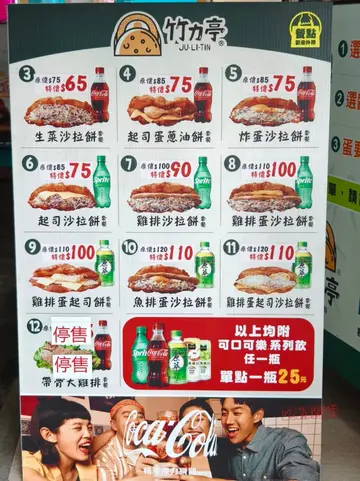 台南超狂超浮誇蔥油餅!下午茶想吃什麼呢?雞排?蔥油餅?來這兒就對了,雙重願望一次滿足👌。這裡的蔥油餅不只是蔥油餅,還可以將雞排、魚排、沙拉、半熟蛋或是起司通通包進來一起享用❗️富含咬勁的餅皮搭上爽脆的生菜、厚實鮮嫩的雞排,還有半熟蛋的滋潤,相當好吃~選一個對的時間就不用等太久XD,我們喜歡在店家剛開門的時候來吃上一份雞排蛋沙拉蔥油餅當午餐竹力亭-雞排蛋沙拉蔥油餅的菜單底加啦,最新最完整資訊請依店家現場為主在店家內用區的工作台這一側,有店家的歷史紀錄,從一開始小攤販、一路搬家一路茁壯、最後定點在永康現址這裡,然後也,然後也有不少媒體聞香而來,像是三立新聞的「5食故我在」、TVBS「食尚玩家」、八大電視台「世界第一等」等等,可以說是遠近馳名的蔥油餅~店家的蔥油點都是現場製作再放到稍微涼一些再開始動作。因為很多道餐點都是搭配生菜沙拉,如果是熱熱的餅直接夾著生菜沙拉,那麼生菜的口感會變軟,會少了點清脆的口感,所以店家才會將餅稍微放一下,一方面可去油,一方面則是可以增加整份餅的口感豐富度竹力亭的另一個特色就是炸蛋了,如果你也是喜歡爆漿口感的蛋,那麼在點餐的時候記得要提醒店家喔!我們這天的半熟蛋,經過高油溫的伺候,蛋白還帶點脆感、半熟蛋黃在享用過程緩緩流出,香氣整個超讚的有餅有蛋,再加上雞排、沙拉,然後加上一點沙拉醬,阿娘喂~口感口味都很豐富捏❗️❗️來看我們這天享用的午餐+下午茶大餐吧~8 雞排蛋沙拉餅現點現做的的雞排蛋沙拉餅是竹力亭的人氣餐點,也因為是現點現做,人多的話的是需要一點等待時間的。如果不想等待,也是可以先打電話預訂📞電話:0963 509 339我們家的小朋友也很喜歡這裡的蔥油餅,餅皮酥酥脆脆的包覆著鹹香且富含肉汁的雞排、還有生菜沙拉&闆娘自製沙拉醬的點綴、最重要的是還有很加分的食材👉半熟蛋,整體張開大口也很難一口咬下的厚度,大口咬下超滿足、整份吃完超飽足!11 雞排蛋起司沙拉餅相對於剛剛的雞排蛋沙拉餅,這份餐點又多了點我們很愛的食材👉起司。起司的香氣搭配半熟蛋黃的搭配真的是絕配、細細感受眾多食材帶來的口感豐富度,這是一份吃完會讓人意猶未盡的好味道!9 雞排蛋起司餅如果是不喜歡生菜的朋友,竹力亭也有提供沒有生菜的餐點選項。可以更直接地感受到雞排、爆漿蛋、起司的完美結合,吃完好想再來一份啊,只是肚子已經太滿了XD小提醒,喜歡半熟蛋的朋友,點餐的時候要跟店家說明清楚喔,才能像我們這樣吃到美味蛋 & 拍出美照12 帶骨大雞排現點現炸比臉大的帶骨大雞排,麵衣薄脆、肉質鮮嫩,而且還保有豐富肉汁,再搭配適度的調味粉提味,這雞排的香氣真的很不錯捏~現場熱熱吃超好吃很想拍出肉汁的照片,但是技術還不到位,建議直接來現場吃直接感受👌只吃下午茶,沒有飲料怎麼行?搭配飲料享優惠👍牆上有冰的介紹,原來老闆娘也會做冰捏,選用天然的食材做出來的冰,吃得出真材實料❗️感覺好像在享用冰淇淋狀態的果汁、果菜汁,超健康的口感查看更多