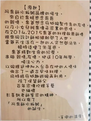 在2014、2015年喬爸的料理啟蒙師傅跟來碗設計者相繼離開人世當每天生活在一起的人突然消失,頓時產生的失落感...((這種感觸魚仔懂...因為我的哥哥現在也生活在跟我們不同的空間...))喬爸將對生命的經歷,串連親情、友情將畢生所學、傾注心力以碗粿延伸加入台南在地的人情味,做出了一道古早味料理!!!喬媽私念哥哥的親情,喬爸想念府城碗製作者的友情,以及小女兒雅喬傳承家業的感情阿喬師水粄粥 因此而誕生...這是一個化思念為力量、延續傳承意義,有手中溫度的古早味地方美食質樸的店內空間可以看到許多古早味的擺設彷彿踏入時光隧道般,回到童年記憶中那巷口的親切老店。【菜單 MENU】 牛蒡絲 NT$30元吃過幾次牛蒡小菜,就屬阿喬師的調味最深得我心完全沒有牛蒡獨特的氣味((有的人不是很愛這味...我也尚可接受,那樣...))絲絲纖維、清爽脆口的口感、滋味,是餐前最佳的前菜無誤 涼菜醃 NT$30元運用當季食材,不時替換內容物還蠻值得一吃的...個人覺得很開胃啦!!!簡單卻十分不簡單的懷舊味道... 水粄粥(小)NT$60元六道古早味!!集結一碗水粄粥!!水粄粥內容物包含 米粄、米糜、蝦米、豬肉、香腸、蛋酥每個配料都需經過二至三道蒸、煮、炒、炸、燉的繁瑣製程米糜 從喝牛奶到吃飯這段過渡期媽媽餵嬰兒的副食品。老闆將虱目魚骨精華高湯以小火煨米成粥,慢火煨至米化入魚湯中防止燒焦中間過程需不斷攪拌,光是煨米成米糜就得耗時辦天時間...吃水粄粥有順續,第一步 先嚐米糜 和虱目魚一起熬製出的米糜完全沒有腥味,比清湯湯頭稠、又比濃湯要淡...剛好介於兩者之間的口感滑順好入口,喝一口體會鮮魚味在口中溢出的滋味果然,熬製半天才有的虱目魚米糜不是蓋的,充斥著懷舊古早手法味呀!!!第二步 再吃水粄『粄』是客家米食中的特色,即閩南人所說的『粿』從小到大就很愛吃碗粿的魚仔自然最抗拒不了這類的米食我嚴重懷疑我上輩子大概是客家人來著!!!第三步 整碗稍微拌一下以米糜搭配水粄、三層肉、香腸、蛋酥豐富組合各別享用每一口給味蕾的盡是不同完美的層次感享受熱騰騰的口感伴隨著鹹香精華的流動,絕對萬分滿足!喜歡吃辣的人再來點店家自製辣椒,別有一番風味對生命的經歷,串聯親情、友情及台南在地的人情味保留了師傅百年家傳炊粿手藝,融合彭老師認真打拚的客家精神打造這碗不簡單的粥,一口濃厚的情感湧上心頭...水粄粥可是店內限量的超人氣商品,晚來了不保證吃得到!!!!!!…查看更多