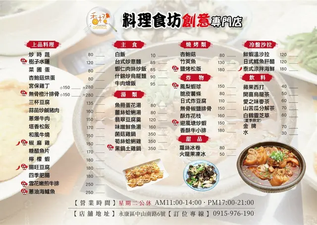 和老婆來下館子!是朋友推薦的一家永康熱炒家常菜餐廳。店面雖然不大,但菜色都是花了心思,讓我們家第一次來吃就愛上了!▽香橙料理食坊的自我介紹XD▽黑板上的私藏菜單,我們就照上面點了幾道想吃的,第一次來的朋友也可以像我們這樣做,吃特色菜就對了!▽冰箱有飲料,可以自取,餐後再結帳。▽我們有點一道椒香豬腳,因為看到牆上滷豬腳海報覺得好可口,食慾都上來了!▽總菜單。想吃哪道私藏菜單用寫的在白色框。▽餐點是現點現炒,一道道香噴噴的菜上桌,聞著香氣肚子開始叫了!▽首先下手的當然是豬腳XD這道是椒香豬腳,不會辣,倒是吃起來麻麻的,花椒被淋上熱油爆出花椒香,非常香!豬腳皮滷得很透,老闆說需滷製約一個小時,隨後繼續燜到透熟。吃起來軟糯糯的又不失Q度,一口吸進去好滿足,吃完豬皮再吃裡面的瘦肉,肥瘦搭配胃口大開!身為豬腳控寫著寫著又流口水了!▽再來是米香魚片,我老婆想吃吃看。很特別!第一次吃到裹著米下去炸的魚片,外面是爆米香的感覺,酥酥脆脆的,裡面是鮮嫩的魚肉,老闆說用的是無發的多利魚,魚切成薄片,整個吃起來有點像帶夾心的餅乾!還有一定要沾它搭配的特製羅望子醬汁,酸酸甜甜的很開胃也去油膩,整個覺得是一道中泰合併的創意菜!有南洋風味!▽接下來是一道素菜,雲耳炒菌菇。老闆說這是蠔菇,又叫黑美人菇,炒起來有不一樣的特殊菇氣!我覺得老闆火候和調味掌握得很不錯,用的黑美人菇味道也很特別,通常菇類、木耳類都會有一股它們特有的味道,老實說我不是很喜歡那種味道,但經過老闆料理之後,我居然覺得吃起來鮮美多汁誒!連我老婆也訝異難得我吃那麼多菇類。 ▽炒空心菜。清脆、蒜多、色澤漂亮,這樣就很好吃了!▽湯類我們點味噌鮮魚湯。送上來的時候好大一碗,這樣165元很划算,鮮魚是用大隻海鱸魚,肉厚帶魚皮、無刺,是我們喜歡吃的口感!吃起來很開心!份量上我覺得四個人比較剛好,兩人吃太多了🤣這次我們有點太貪心點太多,但是很好吃口味很合胃口所以又捨不得剩下來,結論就是又吃撐了!我覺得香橙料理食坊應該是我會特地跑來吃的餐廳,很想再試試看其他菜色,下次會帶小朋友一起來!香橙料理食坊地址:台南市永康區中山南路6號電話:0915 976 190時間:11:00-13:30、17:00-20:30(週二休息)檢視較大的地圖…Read More