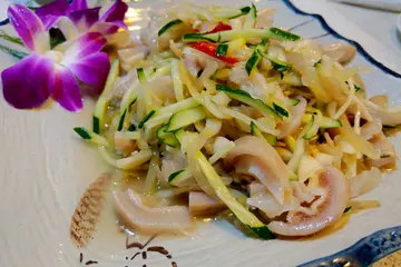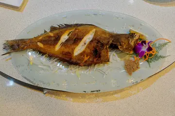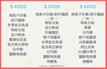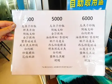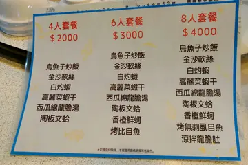 白灼蝦 / 石斑魚鱗膠原蛋白甜點 / 西瓜綿龍膽石斑湯 / 虱目魚五柳枝 / 金沙軟絲 / 香橙鮮蚵 / 烤去刺虱目魚 / 烤鱸鰻 / 烏魚子炒飯 / 破布子炒水蓮 / 蚵仔麵線 / 麻油香煎處女蟳 / 絲瓜蛤蜊 / 鳳梨蝦球 / 蝦干高麗菜 / 蝦乾高麗菜 / 龍魚腸膽西瓜綿 / 龍蝦干貝生魚片 / 龍膽西瓜綿湯 / 蟹黃娃娃菜