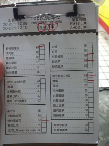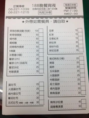 188晚餐宵夜 白天經過拍的所以人是隔壁攤位的之前有看過介紹經過生意也都很好這次難得有機會來吃消夜就來瞧瞧晚上生意真的很不錯用餐當天已經23:30左右整間店依舊人聲鼎沸用餐還要等呢!!據說這家麻油雞有名但是用餐當天並沒有提供就來看一下菜單吧營業時間雖然到02:00但是只要餐點賣完就會停止供應當天軟骨已經沒有了價位也很平價選擇也還算多因為沒有軟骨換豬肉片咖哩味道一般般德式熱狗很像好市多那種味道一般的炒蛋 燒肉蛋土司吐司有去邊可能沒有點到厲害的餐點所以就是很普通我比較愛勝利早點週一-週六:17:00-1:00 只收現金06-2211039台南市中西區民生路二段188號…查看更多