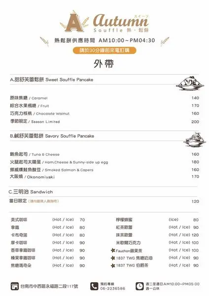 第2次來「Autumn舒芙蕾熱 鬆餅」,同樣是碰碰運氣當日致電預訂後補12點~下午2點的座位,很幸運1:30接到電話,二話不說火速趕到,因為現點現作…在電話裡直接先點好餐。老話重提…在日本吃過Bills、ELK、GRAM,台南就autumn、口感最雷同,而星乃珈琲 的口感就比較像台南的T’WIN coffee 咖啡’ 云,它也是我的心頭好。另外圈子 brunch.coffee也不錯,用餐座位多,不需要預約排隊。 autumn的座位不多,永福路二段騎車來也比較方便,附近的停車格不好找,在電話中,店員清楚告知座位只能坐到下午3點,所以我們先電話裡點餐,到店也已經1:52分,餐點約2:10送上桌。(一般用餐時間2小時)就是為了限量的草莓鬆餅而來,電話確定有就剎過來了!!現點現打現煎,如此費工費時也是它美味的關鍵,真心覺得在這裡上班需要一雙堅強的手臂,每次經過都忍不住多看幾眼,心生佩服…第一次來是坐面外的高腳座椅區,這次來坐在最裡頭的位置,小溫馨的圍氛…依舊是人氣強強滾。現場有空位,都是客人提前離開,剩下的時間不多就等下一桌預約的客人,也無法接待現場的客人。autumn不加收服務費,點餐、飲用水、糖包奶球,自己動手拿!!這裡還有很多童書、旅遊雜誌。舒芙蕾熱鬆餅是店內的招牌,部份餐點作小幅度的調漲,此次的草莓鬆餅(限量)定價在$280,價位很合理,可以說沒有因為草莓銳減,因成本提高而調漲哦!建議加80元升級套餐三選一,點飲料可再折抵100元,很划算。每人最低消$100,我們點2個舒芙蕾熱鬆餅,其中一份加80元升級套餐草莓鬆餅(限量) $280原味舒芙蕾熱鬆餅淋上大量鮮奶油、舖滿新鮮草莓、附上草莓冰淇淋、煉乳…無敵美味,拍了好多誘人照片後就秒殺吃光!!一整個好滿足草莓和煉乳根本是絕配,沾上鮮奶油也好好吃,後來發現底部還有手作草莓醬,CP值超高的,有機會想再來吃一次。一保堂抹茶紅豆白玉 $280選用一保堂抹茶調配而成的抹茶舒芙蕾熱鬆餅,放上白玉再淋上蜜紅豆,附上抹茶冰淇淋、抹茶醬,是”抹茶控”會失控的抹茶甜品!!淋上微甜的抹茶醬更香濃可口,抹茶舒芙蕾熱鬆餅可能因為加入抹茶的關係,比較沒有像原味的那麼澎皮,入口同樣濕潤棉密。加80元升級套餐:當日果汁今天和上次喝到一樣是蜂蜜櫻桃汁,濃郁蜂蜜香、微微的甜很順口。加80元升級套餐「任選飲料折抵100元」:拿鐵 +$30(原價$130)香醇好喝的拿鐵拉花,好適合搭鬆餅享用 。美味的鬆餅是值得等待的,不少人得知沒座位後,還是選擇外帶一份回去!!外帶可先致電過來就不用等哦…想一飽超誘人的舒芙蕾熱鬆餅記得早一點訂位,準時到場就能輕鬆自在的享用快樂下午茶時光。Autumn舒芙蕾熱·鬆餅 地址:台南市中西區永福路二段117號電話: 06-223-6586營業時間:10:00~17:00(週一公休) 食記:吃是很主觀的,純屬個人口味分享 供參考(可能因選擇的餐點、當日食材、客源狀況而有所不同)圖文版權所有,轉載分享請告知並註明出處,盜圖必究…查看更多