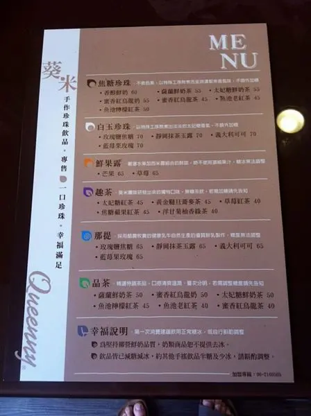 慶中街三角窗對面是波哥。單從外觀就是很不一樣。中午用餐時間生意相當好。看來都是女性消費者比較多,小高有發現甜食好像是許多女姓無法抗拒的。 寫連鎖茶飲店是小高的罩門,經過一連串的茶飲食安風暴,從塑化劑、香精、奶精、果糖、茶葉農藥超標,徹底把我對手搖飲料信任給毀滅,為何小高我這麼在意茶飲的食安呢?我只能簡單說高溫油炸食物、炭烤、麻辣火鍋等,媒體也在常常呼籲吃多有礙健康,但小高為何還是不思索去品嚐寫分享文,「因為我們大部份人不可能每天吃,但手搖飲料卻很多人每天喝」,而且是有很多人是照三餐喝,您說這嚴不嚴重啊!所以小高目前只寫波哥,葵米算是第二個,沒辦法在這麼多連鎖飲料店裡海尋知己不多。準備三年的葵米於2014年5月創立於台南,以「一口珍珠,幸福滿足」為主要訴求,第一家店是開在台南慶中街巷弄三角窗,選在這個地點應是設定社區型經營的模式,裝潢氛圍與粉圓製作的市場差異化取勝,重點是他們在網路行銷下足了功夫,經營的策略真的有他獨到的地方(佩服),老闆本人就是學設計難怪才會有跳脫的經營模式,且在整體品牌的各方面設計處處令人驚艷,小高今天寫這篇文章並不是要捧他,我還是那句話去做消費者就好,光鮮亮麗的加盟體系,要加盟都得做足評估工作誠心的建議。當然小高來就要先研究食安的問題,店家把厚厚一本檢驗報告放在大門供翻閱,看看有哪一家飲料店這麼用心,會整理一本安心手冊放在大門口很少啦。以上SGS 檢驗報告大都是台灣的產品,而且都自行送驗值得嘉許。櫃檯旁邊的海報製作相當精美,果然是學設計的團隊很棒的海報。整間裝潢完全跳脫一般茶飲店,雖然不是很豪華但相當高雅,讓人感到氣氛是咖啡店的的元素。旗艦店有提供內用區且有洗手間,能讓大家舒服慵懶喝杯珍珠奶茶。店面的裝潢元素大致是以粉圓的顏色為設計概念。櫃檯的服務人員似乎有特別挑選過,制服也是以飲料顏色為設計元素很高雅,且每個人都掛上了透明安全性口罩。櫃台服務人員態度非常好且從容,果然有是有精心挑選過。Menu是紅茶類為主要茶飲。紙杯的容量是少見的500cc。簡單的白色杯子加上Logo簡潔美觀。這裝茶葉的容器也是Logo形狀,也很感謝店家願意讓小高拍茶葉。這是紅茶系列所使用的茶葉,小高只能說這個茶葉外型很完整,應該不是機剪茶而是手採茶,如果再對照檢驗報告是台灣茶葉,那當然茶葉的成本就非常高。一整鍋的手工粉圓晶瑩剔透,像這種粉圓一般都是當天現做的。小姐開始裝粉圓份量相當豪邁👏。裝好粉圓開始製作飲品。要品嚐粉圓當然就要搭配奶茶,奶茶的好朋友非紅茶莫屬,奶茶部份使用 California Sunshine和國產乳香世家的鮮乳,以高轉速果汁機均勻攪拌,讓奶茶呈現拿鐵口感超綿密好喝。珍珠紅烏龍奶茶(500cc)55元。「一口珍珠,幸福滿足」就在杯膜上。珍珠紅烏龍奶茶整體口感,珍珠相當軟Q好吃、奶茶濃郁好喝值得推薦💘。樂天小高食後主觀心得分享(僅供參考):寫這篇文章只是要再提醒好友們要注意自己的健康,要喝飲料之前一定要了解飲品的食安問題,現在市面有幾家連鎖飲料店能堅持品質呢,只知道開發票就要調高價錢轉嫁給消費者,500cc使用台灣茶葉價錢55元超合理,總比750cc使用越南茶葉強太多了,但重點是小高只知道葵米的茶葉資料,其他食安的控管小高就不曉得了。檢視較大的地圖Queenny葵米。珍珠飲品專售住址:台南市中西區慶中街196號電話:06-2160505營業時間:am10:00~pm20:00…查看更多