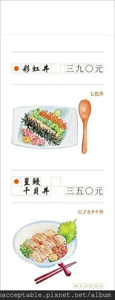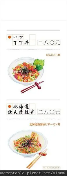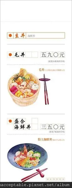 整間店以丼飯為主,分為生丼熟丼,其中生丼就是指海鮮類的丼飯啦,