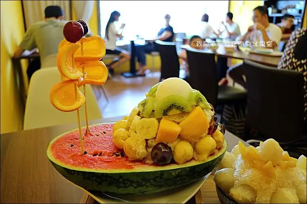浮誇水果帆船180元(自己亂取的),用了半顆西瓜當容器,柳橙片當風帆,還有葡萄、芒果、香蕉、玉荷包、鳳梨、奇異果,居然還有蕃茄夾蜜餞,最上面是一球香蕉清冰,挫冰的糖水是冬瓜茶,特別又不會很甜,水果種類真的好豐富,而且都很新鮮,品質很好,要說唯一的小缺點是西瓜沒有冰,是常溫。