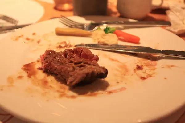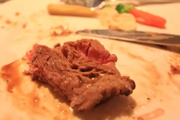 特寫看到沒牛排充滿了筋,連切都非常用力切切不斷,你想用口咬會怎麼樣呢失望中,吃我太太那盤就還好,但結論是應該烤的太熟了很難入口。