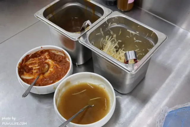 吃牛肉湯必備的醬油膏、豆瓣醬、薑絲,以及白醋等醬料都放在餐檯上讓客人自行取用