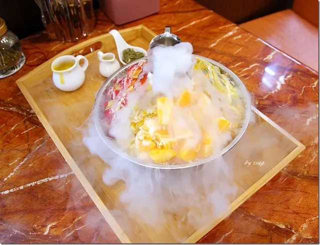 使用火鍋大小的鐵鍋裝盛,最底層是黑糖剉冰,