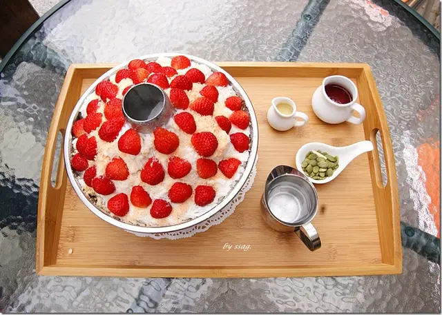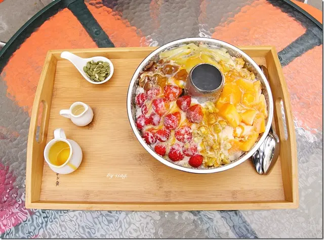最後淋上自製芒果淋醬,撒上堅果完成。