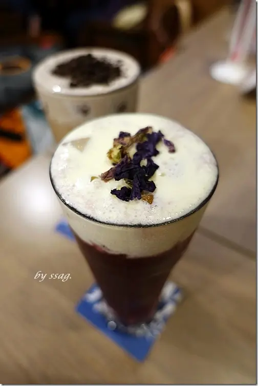 奶蓋上方撒了乾燥紫羅蘭點綴,