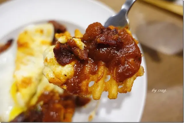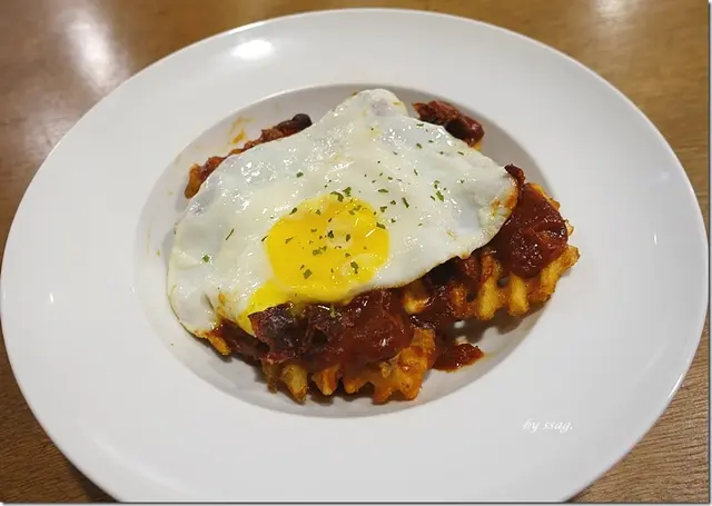 半熟蛋底下藏了酥脆的格子薯條,