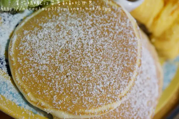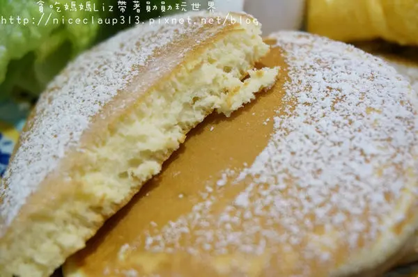 鬆餅灑上了糖粉,如雪花般,一旁還附了不知是蜂蜜還是楓糖,