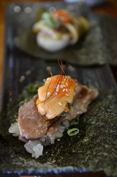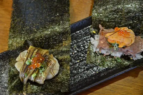 星鰻干貝卷,180元&和牛海膽卷,120元。