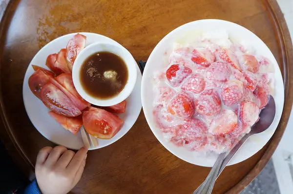 飯後的番茄切盤,季節限定的草莓牛奶冰,
