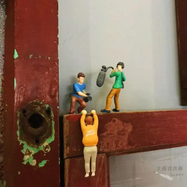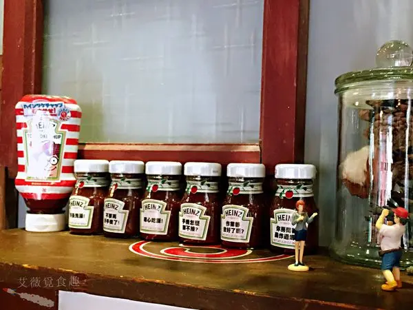 在櫃子和牆上擺了很多小人等裝飾品,艾薇本來想要拿幾個放在餐點旁拍照,但很多都用膠帶黏著,所以就放棄這想法