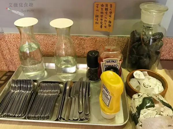 餐具和水等為自助式,請自取。但請使用完畢自動歸位喔,還有其他人要用拉.....