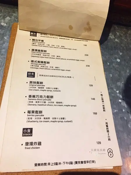 餐點只分為四項,鹹食(早午餐)、甜食(鬆餅)、小點(唐揚雞塊)、飲品和咖啡