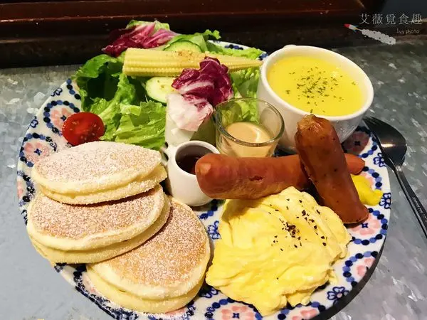 鹹食套餐,有三塊鬆餅、生菜沙拉、馬鈴薯炒蛋、濃湯、日式唐揚雞塊。份量上別看這樣,其實超有飽足感dear