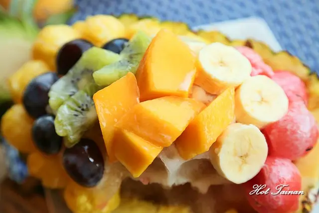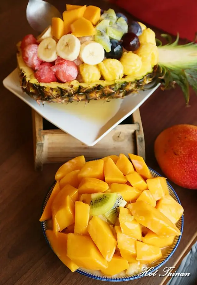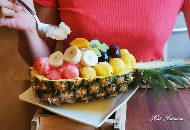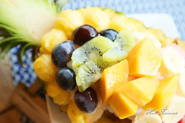 心愛a是標準看圖點餐型,這號稱夏日王國的水果冰,一端上桌就讓心愛a:哇~~了一聲,以半顆鳳梨為基底,上面放著鳳梨、西瓜、香蕉、奇異果、葡萄還有時令的芒果,看上去繽紛又消暑,喜歡吃水果的心愛a自然是愛不釋口啦,淋上冬瓜糖水與鳳梨湯一起喝也很美味耶,心愛a吃不過癮還往下繼續挖鳳梨肉來吃,實在是好吃又好玩呢!