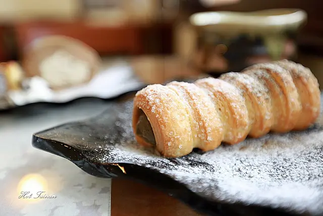 明森捲心酥內餡是自己熬的焙茶卡士達醬,一口咬下去,ㄎㄠˊㄎㄠˊㄎㄠˊ的嘖嘖響,真的也太酥脆了吧,搭配內餡料真的很好吃,甜度上是我也可以接受的,配上抹茶更是能吃出其精隨。