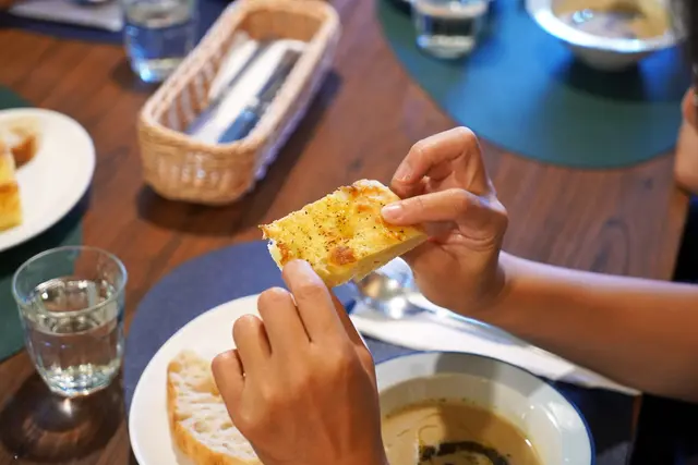 麵包烤得很酥脆,佛卡夏麵包上面抹的橄欖油、迷迭香,微鹹的濃郁香料風味,為後面的美味餐點先開了一道微微的味蕾門縫