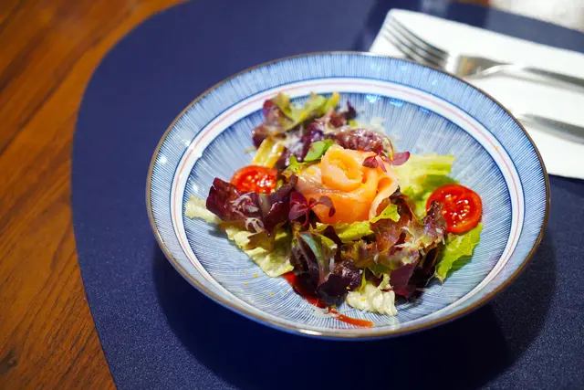 煙燻鮭魚捲成美麗玫瑰花、新鮮生菜、彩色胡蘿蔔片、小番茄,撒上白色起司片,吃起來清爽又帶有起司鹹香,起司片的口感不是軟的,而是像柴魚片那樣非常特別哦