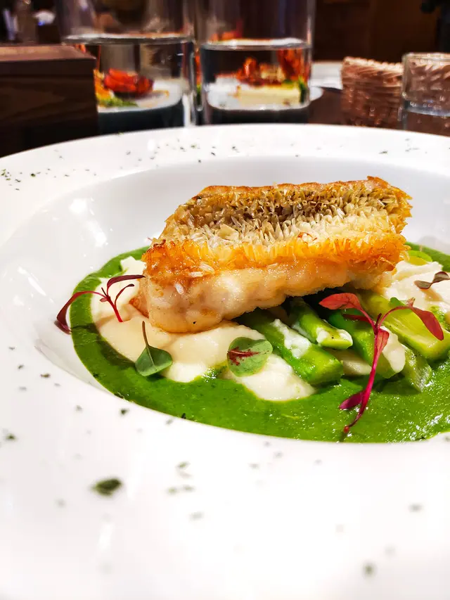 底部醬汁也非常獨特,誰會想到居然是茼蒿!!馬頭魚的魚骨熬成濃湯、加入白酒、鮮奶油,最後拌入茼蒿泥,才成為現在所看到的草綠色醬汁。綠色醬汁上的白色則是馬鈴薯泥