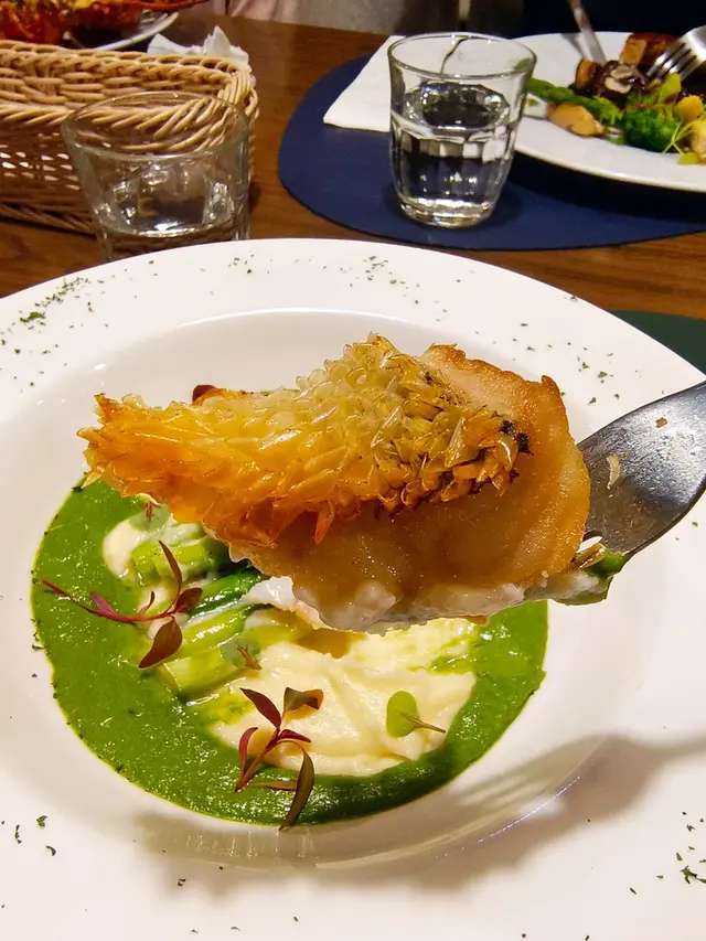 ▼其實一端上桌看到這宛如刺蝟般的鮮魚排,我還很擔心入口會不會刮嘴,結果吃起來酥酥脆脆的很像餅乾,但魚肉卻是非常細嫩,這二種迥異的口感居然完美融合在同一道菜色中,頓時覺得主廚的料理功夫真不是蓋的!紮實鮮嫩的魚肉、多汁蘆筍、馬鈴薯泥、濃稠茼蒿馬頭魚白酒醬汁,四者一起入口,味道相融的很好、互不搶戲,是非常平順的滋味