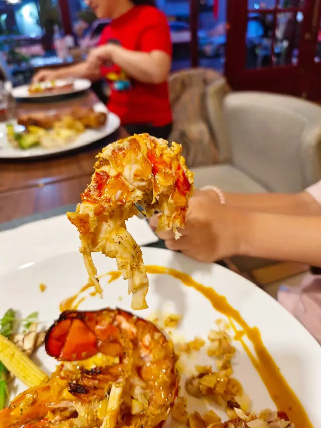▼波士頓龍蝦肉質滑嫩Q彈,厚實的蝦肉,沾上一點香濃的咖哩海膽醬汁,簡單提味一下就非常鮮美,不愧是身為海鮮霸主的龍蝦啊!