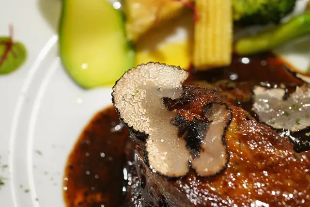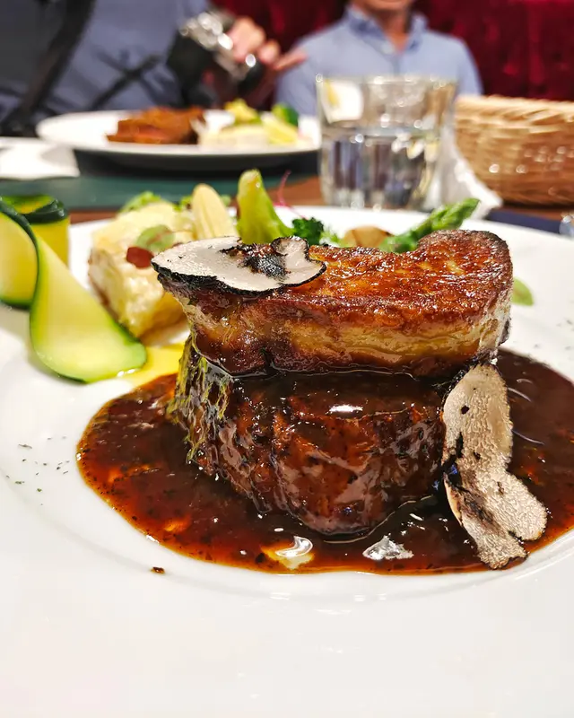 底層是鮮嫩菲力、鋪上香煎鴨肝,淋上主廚精心熬製的紅酒松露濃稠醬汁,最後刨上幾片松露片