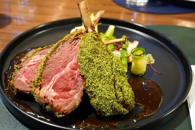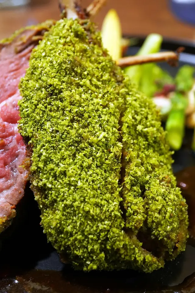 ▼羊肩肉表面刷法式芥蓉醬再烤,微酸的味道帶出羊肉滋味,外層再裹上主廚自製香料粉,以帕馬乾酪、大蒜、百里香等等打碎混入麵包粉製成的香料粉,更添這道爐烤羊肩肉濃郁香料氣味