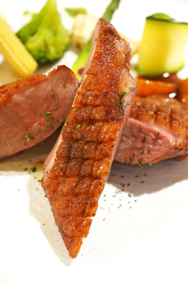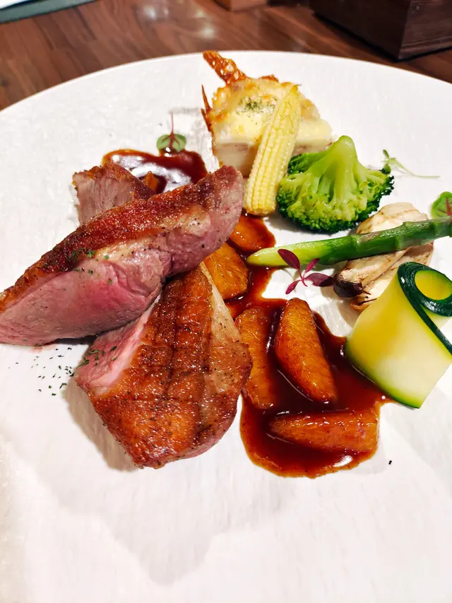 鴨皮酥脆的厚實鮮嫩櫻桃鴨胸肉,佐上香橙蜂蜜醬,香嫩肉汁與酸甜醬汁包裹舌尖,整體的香氣非常足,每一口都是驚艷!