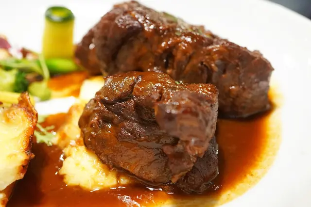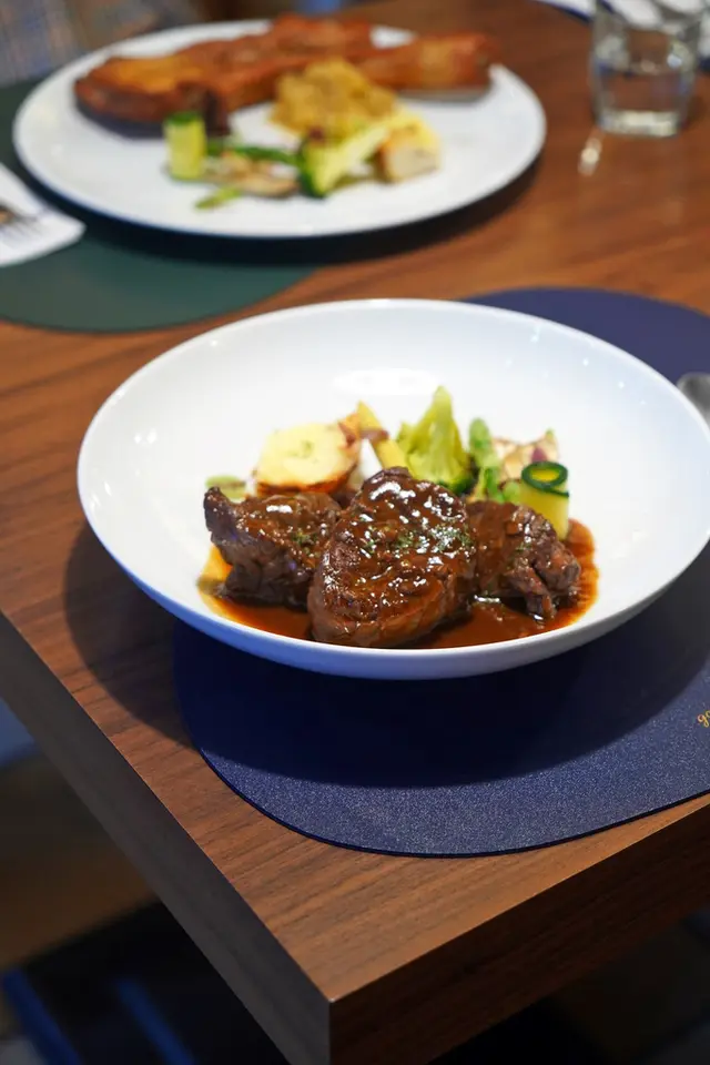 ▼吃起來有股煎烤香氣,紅酒燉汁入味牛肉深處,香味,口味都十分濃郁,帶筋的牛肉部位更帶來多層次口感