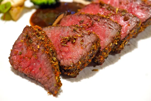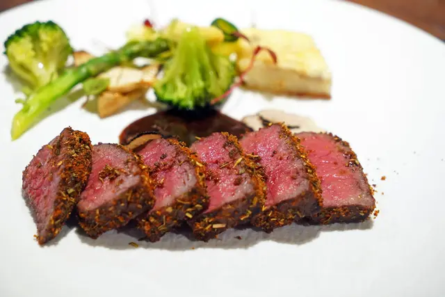 五分熟的無骨牛小排,先用鹽稍微調味,爐烤後外面再裹上肯瓊香料粉