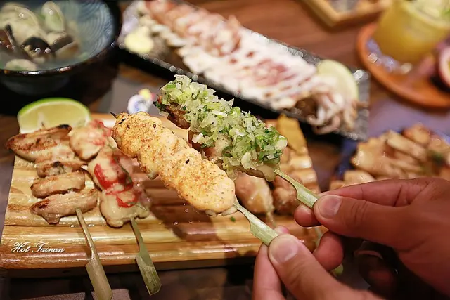 由右到左分別是店家特製的老醬雞肉串、天然鹽雞肉串、鹽蔥雞肉串、明太子雞肉串、紫蘇梅雞肉串、天然鹽雞軟骨,看看單價都嘛超過了五十元,這樣點最划算!店家說這道要吃的話要從右到左吃起,如此更能吃出其精隨喔!