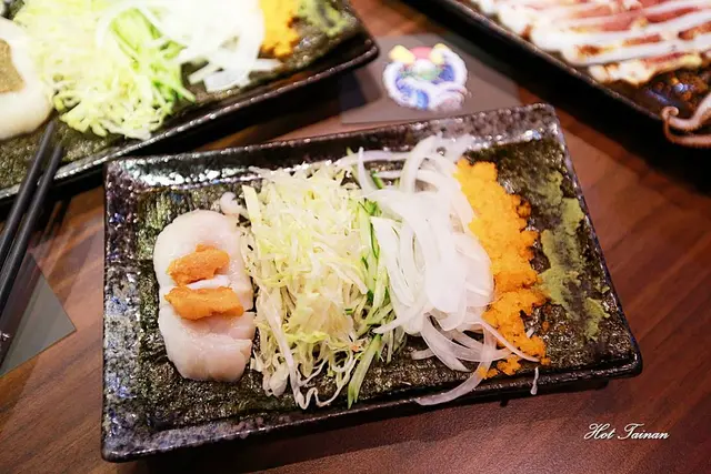 這兩款的價格就比較偏高了些,很特別的是他們呈現出來的是要自己包來吃的方式,我覺得這樣也好!因為可以直接看到裡面的料和量,不然以這樣的價格來講只吃到一點根本不划算,但大家看一下,他們給的份量真的算是很大器了,干貝是一整顆的,海膽和蟹膏的量也不少,直接包起來吃每一口都能品嚐到最原生的風味。