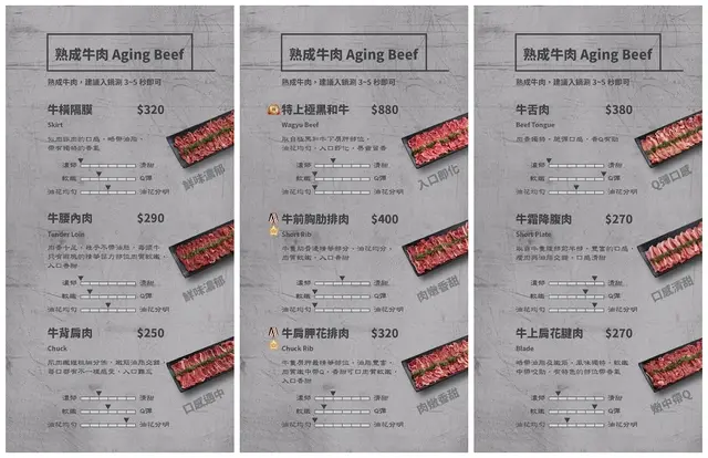 熟成牛肉一共有九個部位可以選擇,價位從250~880都有。