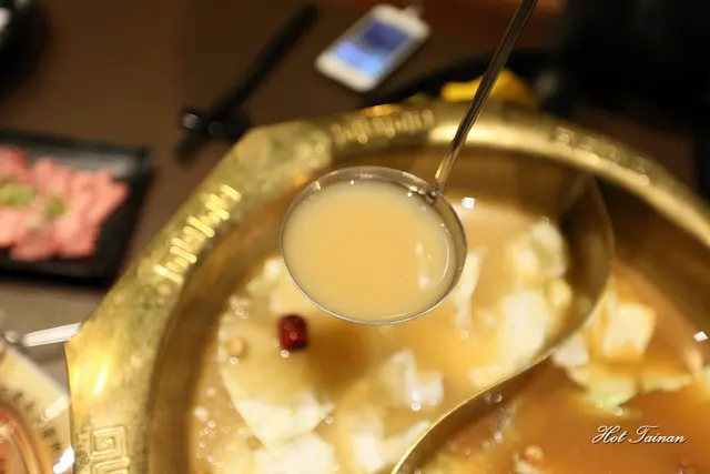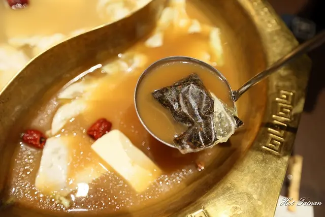 大家有沒有覺得他們的鍋子很特別,真的是很大氣又耀眼的一個鍋耶,普洱牛骨湯頭裡面也就直接丟了一茶包在裡面,而且他們是使用帶肉的牛小排下去熬煮湯頭,成本下頗重!湯頭喝起來就像帶點茶香氣味的牛肉湯~