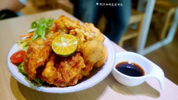 ▲整體份量不算少,炸的金黃酥脆,肉質軟嫩彈牙又多汁,擠上金桔汁,再搭配一旁的鰹魚醬油,讓口感表現的更突出,生菜的部分是搭配和風胡麻醬汁,我非常喜歡,非常合我胃口~