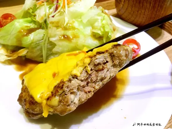 ▲店員說今日的和風漢堡排僅剩一份!又是每日限量,聽到限量就理智線斷了...我要我要...漢堡排是嚴選7:3的牛豬絞肉比例,還有特別加入脫水豆腐,在日本料理上很常吃得到,口感就是超綿密的豆腐,但沒有加非常多,所以感受不大啦~整體肉質非常紮實多汁,搭配上美味的起司,一口咬下便覺得幸福啊!旁邊一樣是炸雞吃到的和風胡麻醬生菜,搭配起來也比較不油膩,限量是有道理的,份量真的非常足夠~